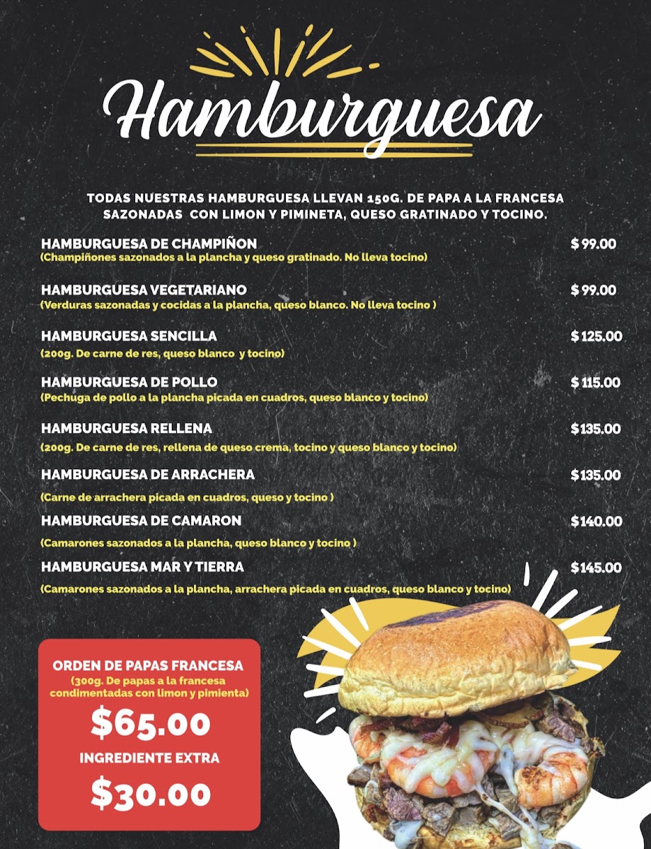 Hamburguesa con arrachera en trozos, camarones sazonados, queso, tocino, papas a la francesa y 1 aderezo a elegir.